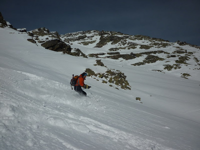 La idea inicial era haber bajado esquiando por el corredor, de hecho porteamos los esquís pero no lo vimos claro y preferimos dejarlo para mejor ocasión que seguro la habrá. La parte medía baja del corredor esta en buenas condiciones para bajar esquiando pero en la parte alta y sobre todo en el lado izquierdo vimos que había mucha nieve sin transformar y que tampoco se había ido hacía abajo como en el resto del corredor, en el corte se apreciaban claramente cuatro capas de distintas nevadas sin haber transformado. No nos importo demasiado, simplemente con la cima de Punta Escarra nos dábamos por satisfechos.